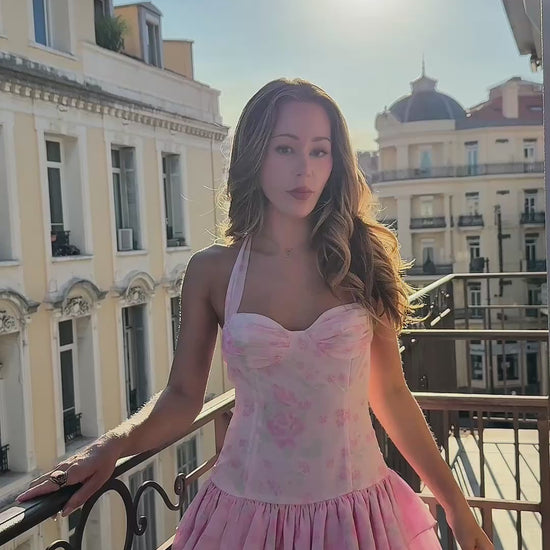 Soft and romantic, this drop-waist mini dress is the definition of effortless charm. Featuring a sweetheart halter neckline with beautifully pleated bust detailing, it gently hugs the body with an easy fit. The delicate pink floral print feels like a summer love letter, while the tiered ruffle skirt adds movement and whimsy to every step. Light, airy, and undeniably feminine, it’s made for golden hour dates, flirty dinners, and twirling under soft lights.