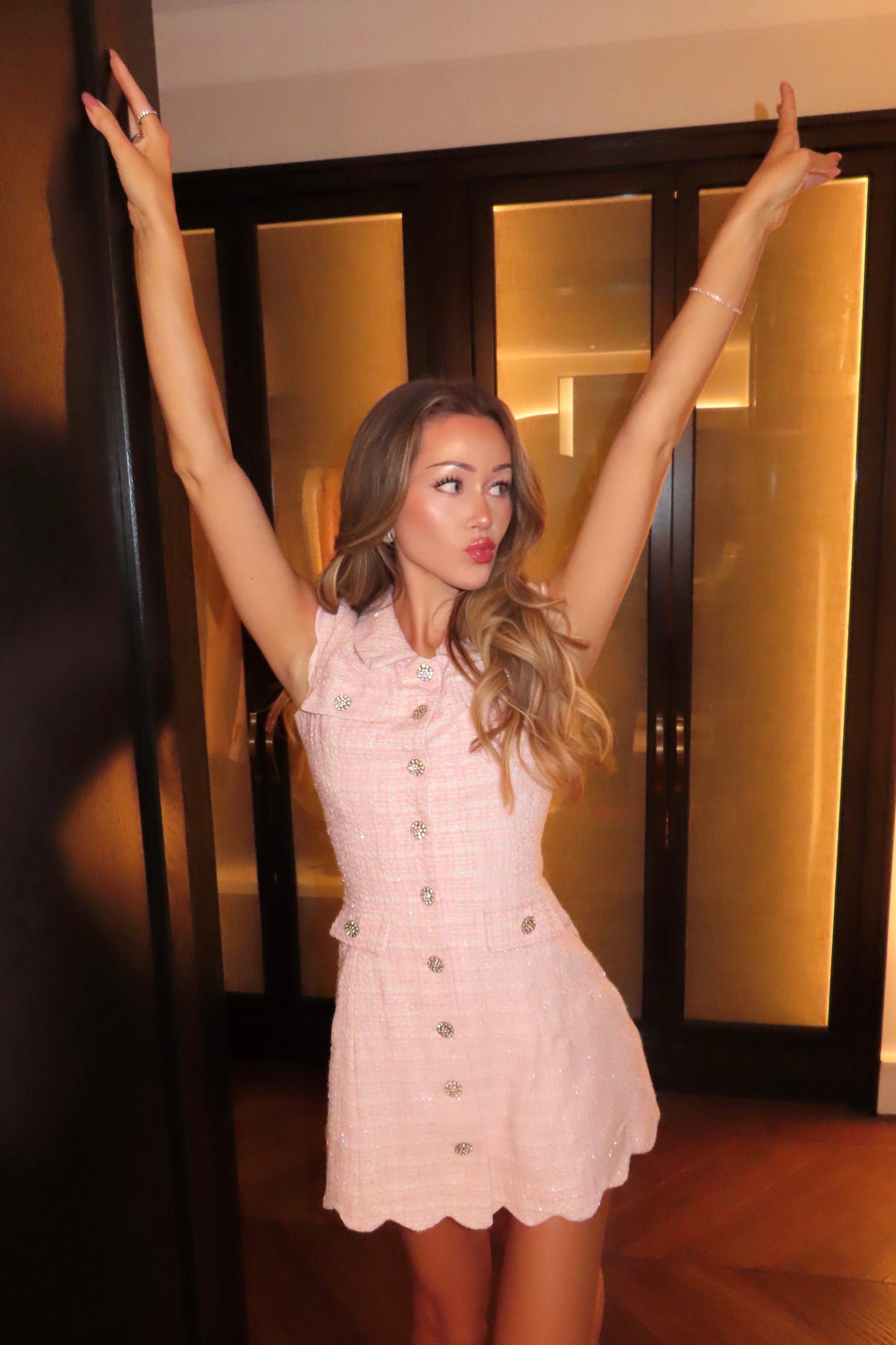 The Cécile Dress is pure romantic charm. Made from soft pink tweed and lined with silk, it hugs the waist beautifully while keeping a sweet, feminine silhouette. The crystal buttons, scalloped hem, and delicate collar give it that timeless French-girl elegance we adore. Effortless, polished, and a little bit dreamy, Cécile is made for your most graceful moments.
